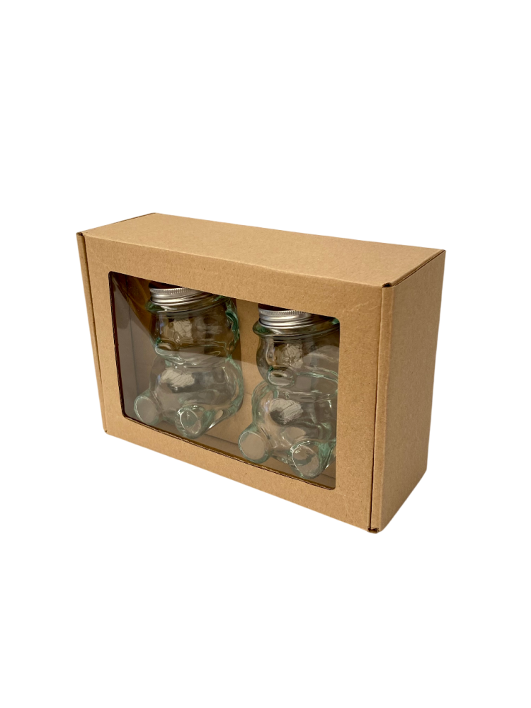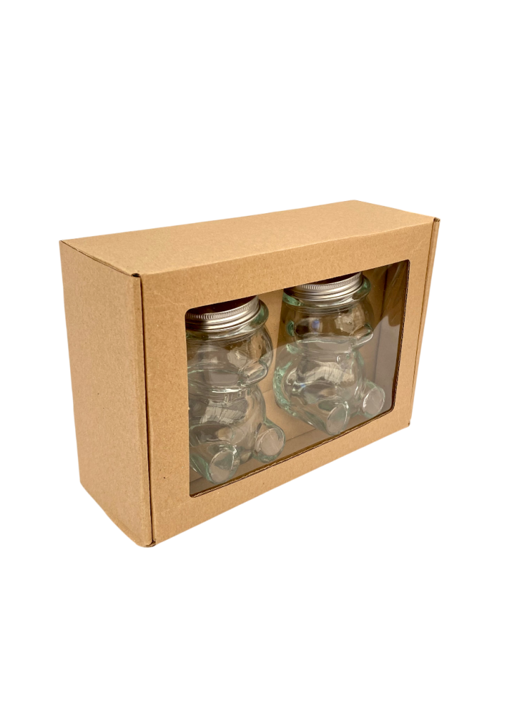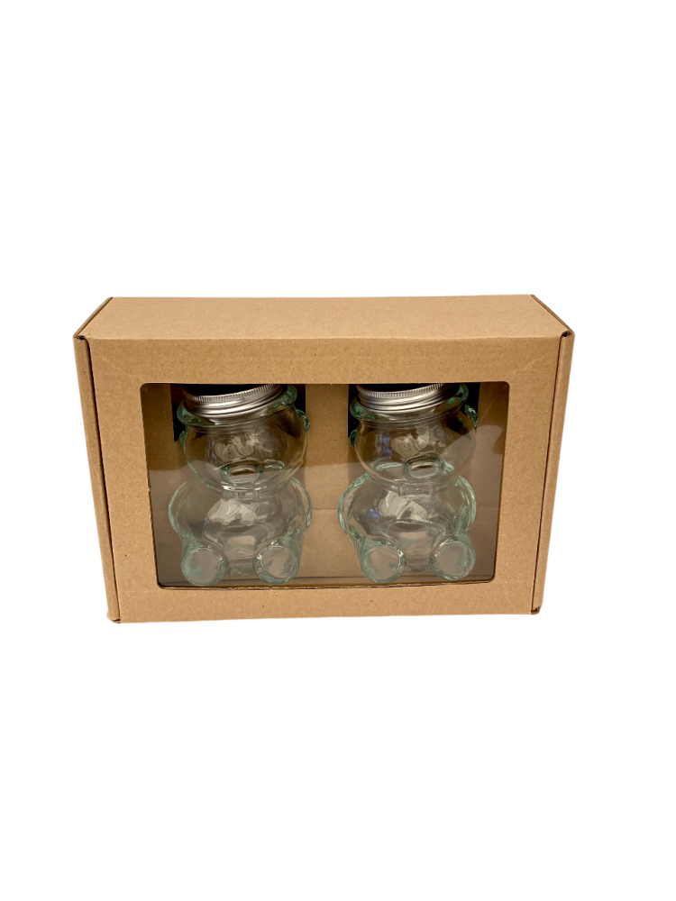 Toto balenie je určené na darčekové alebo prezentačné účely. Pojme 2 kusy sklenených pohárov v tvare medvedíka s objemom 220 g medu (typ MACKO10).