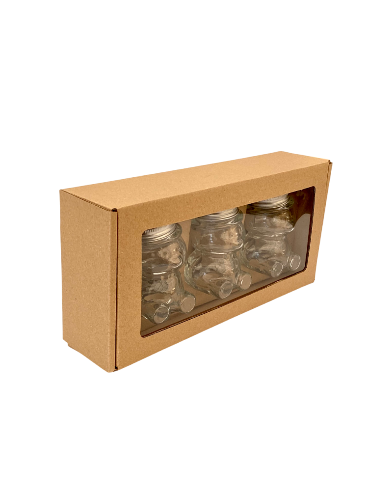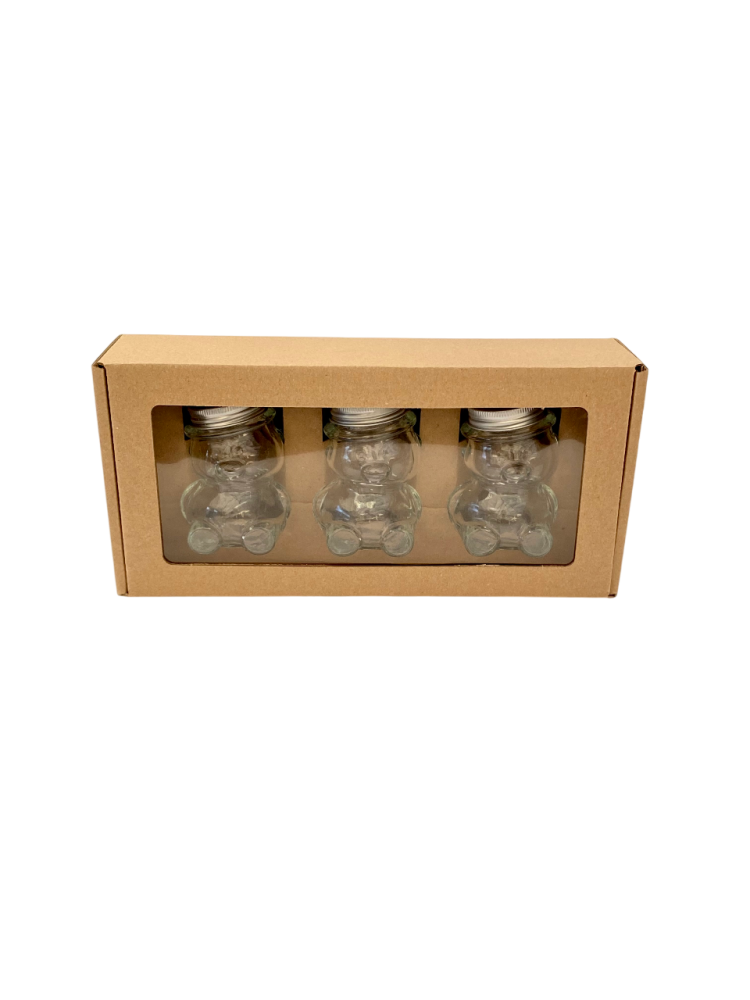 Toto balenie je určené na darčekové alebo prezentačné účely. Pojme 3 kusy sklenených pohárov v tvare medvedíka s objemom 100 g medu (typ MACKO10).