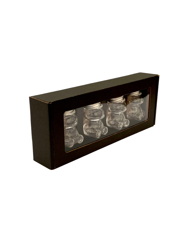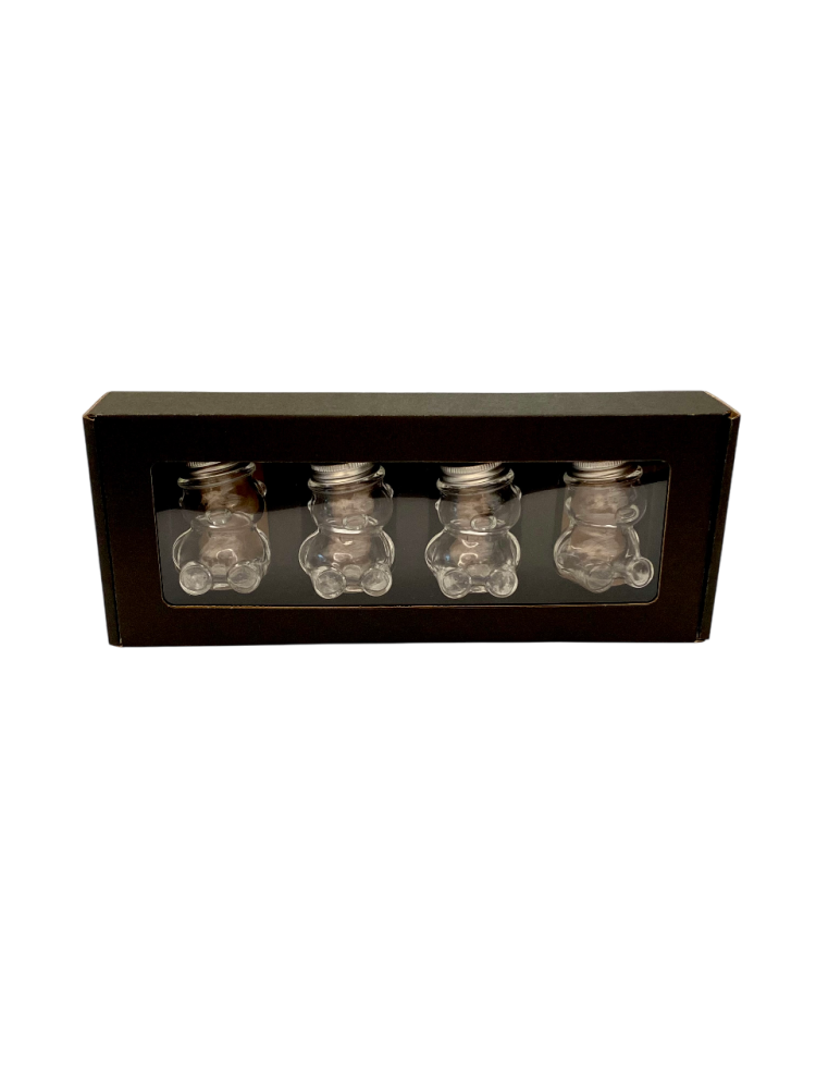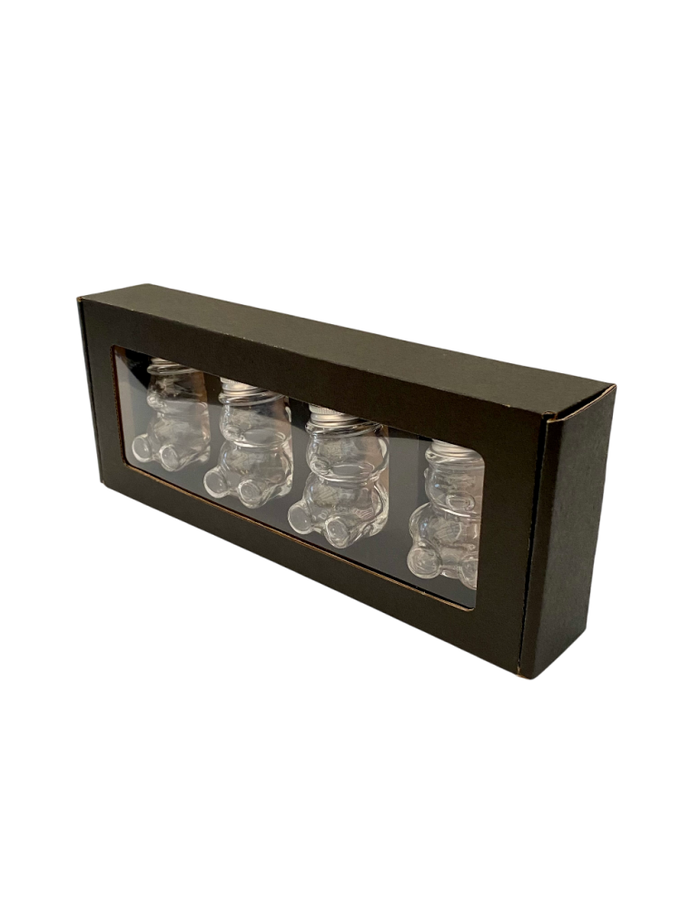 Toto balenie je určené na darčekové alebo prezentačné účely. Pojme 4 kusy sklenených pohárov v tvare medvedíka s objemom 50 g (typ MACKO5).