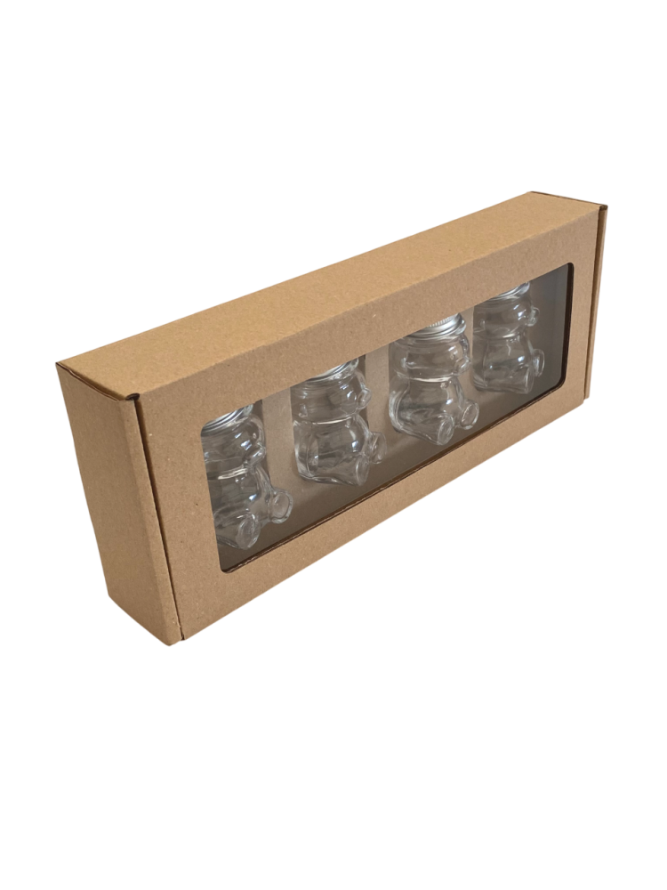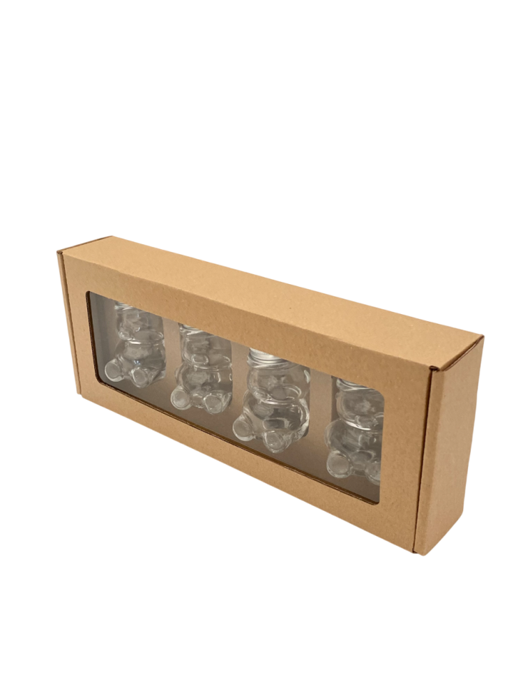 Toto balenie je určené na darčekové alebo prezentačné účely. Pojme 4 kusy sklenených pohárov v tvare medvedíka s objemom 50 g (typ MACKO5).
