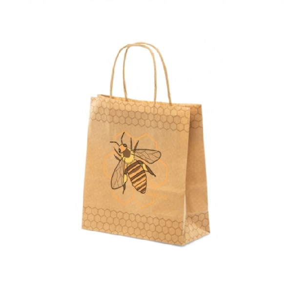 Ekologická papierová taška s potlačou včely na pláste s rozmermi 210 x 190 x 110 mm, vhodná na med a iné včelie produkty. Ucho tašky je vyrobené z pevnej šnúrky.