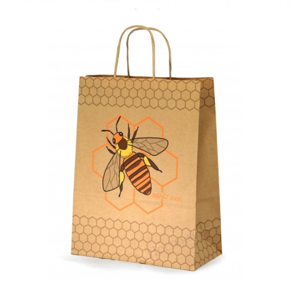 Ekologická papierová taška s potlačou včely na pláste s rozmermi 310 x 240 x 110 mm, vhodná na med a iné včelie produkty. Ucho tašky je vyrobené z pevnej šnúrky.