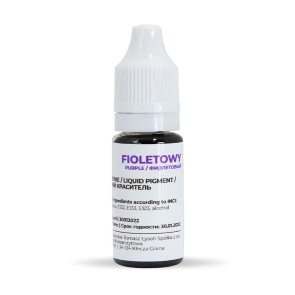 Tekutý fialový mydlový pigment 10ml (16g) určený pre farbenie telovej umývacej kozmetiky. Pigment má vysokú výdatnosť a 1 gram vystačí na niekoľko kilogramov mydla, v závislosti od požadovaného odtieňa.
