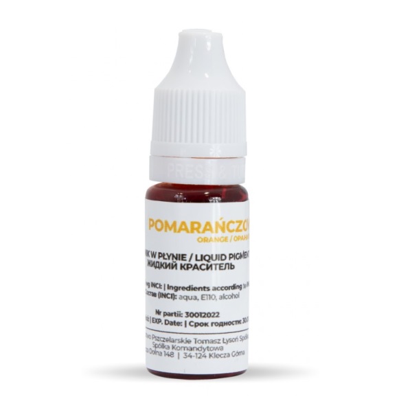 Tekutý oranžový mydlový pigment 10ml (16g) určený pre farbenie telovej umývacej kozmetiky. Pigment má vysokú výdatnosť a 1 gram vystačí na niekoľko kilogramov mydla, v závislosti od požadovaného odtieňa.