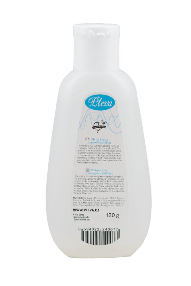 Pleťová voda s materskou kašičkou 120g vyživuje a prekrvuje Vašu pleť. Navyše v póroch zanecháva v bielkoviny, minerálne látky, vitamíny, enzýmy, ktoré obsahuje materská kašička. Používa sa na čistenie pleti. S prirodzeným sedimentom.
