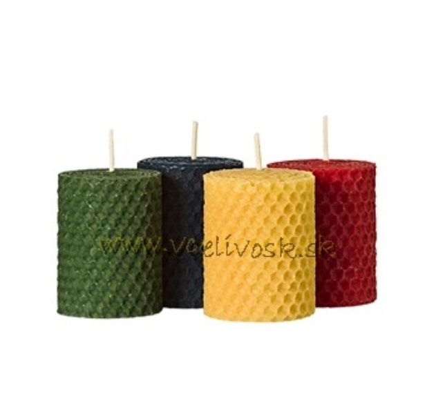 Sada 4 ks malých farebných sviečok z vinutej medzistienky zo včelieho vosku.