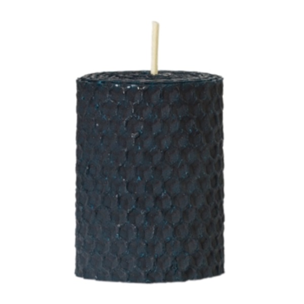 Malá modrá sviečka z vinutej farebnej medzistienky zo včelieho vosku.