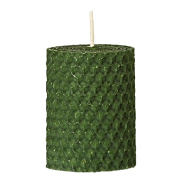 Malá zelená sviečka z vinutej farebnej medzistienky zo včelieho vosku.