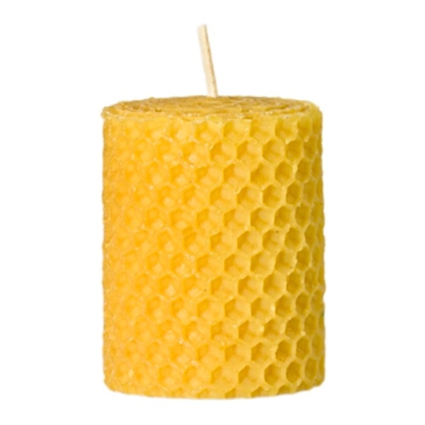 Malá žltá sviečka z vinutej farebnej medzistienky zo včelieho vosku.